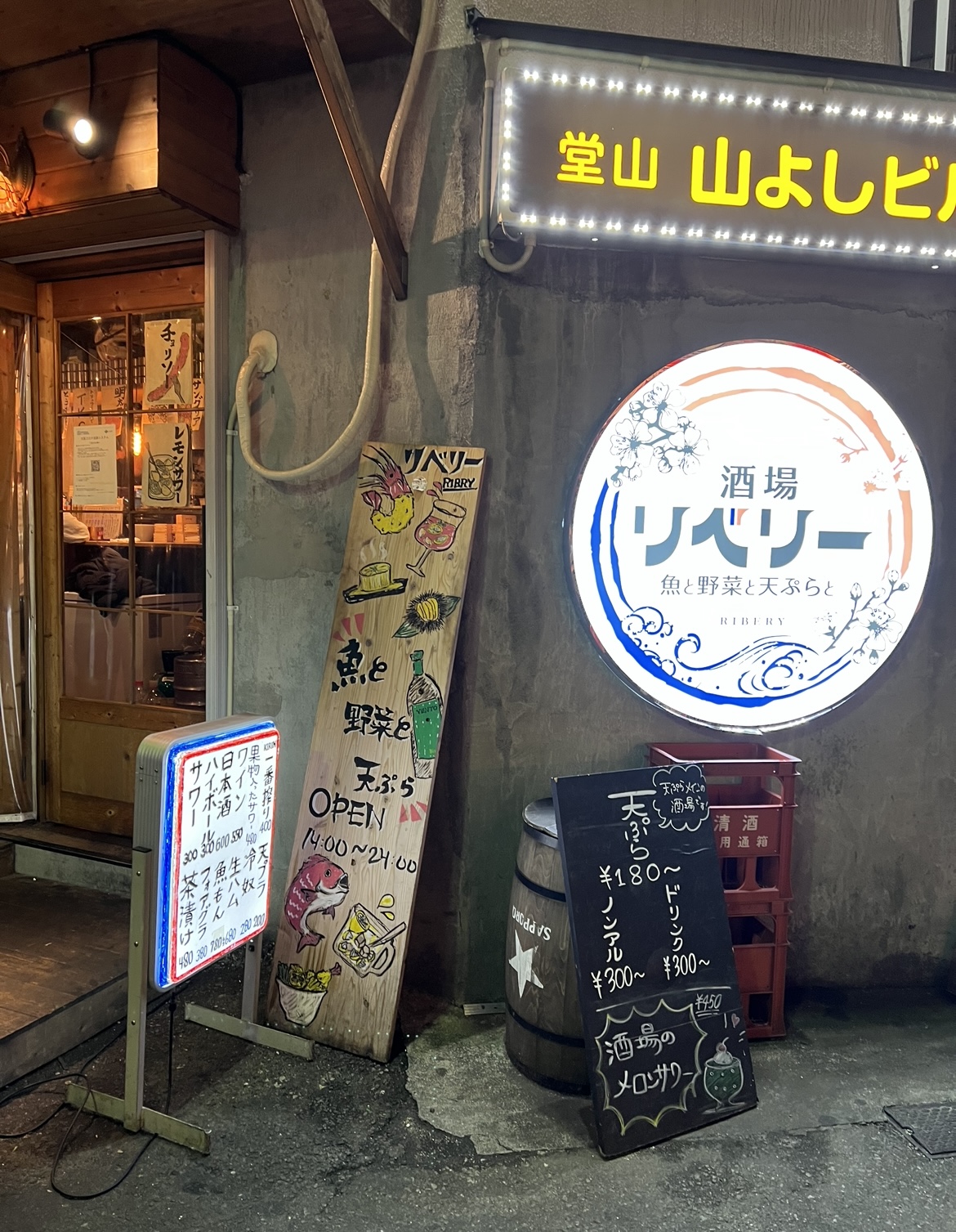 ネオンで明るい居酒屋で、店内はぎゅっと集まった席にお客さんがいっぱいでした