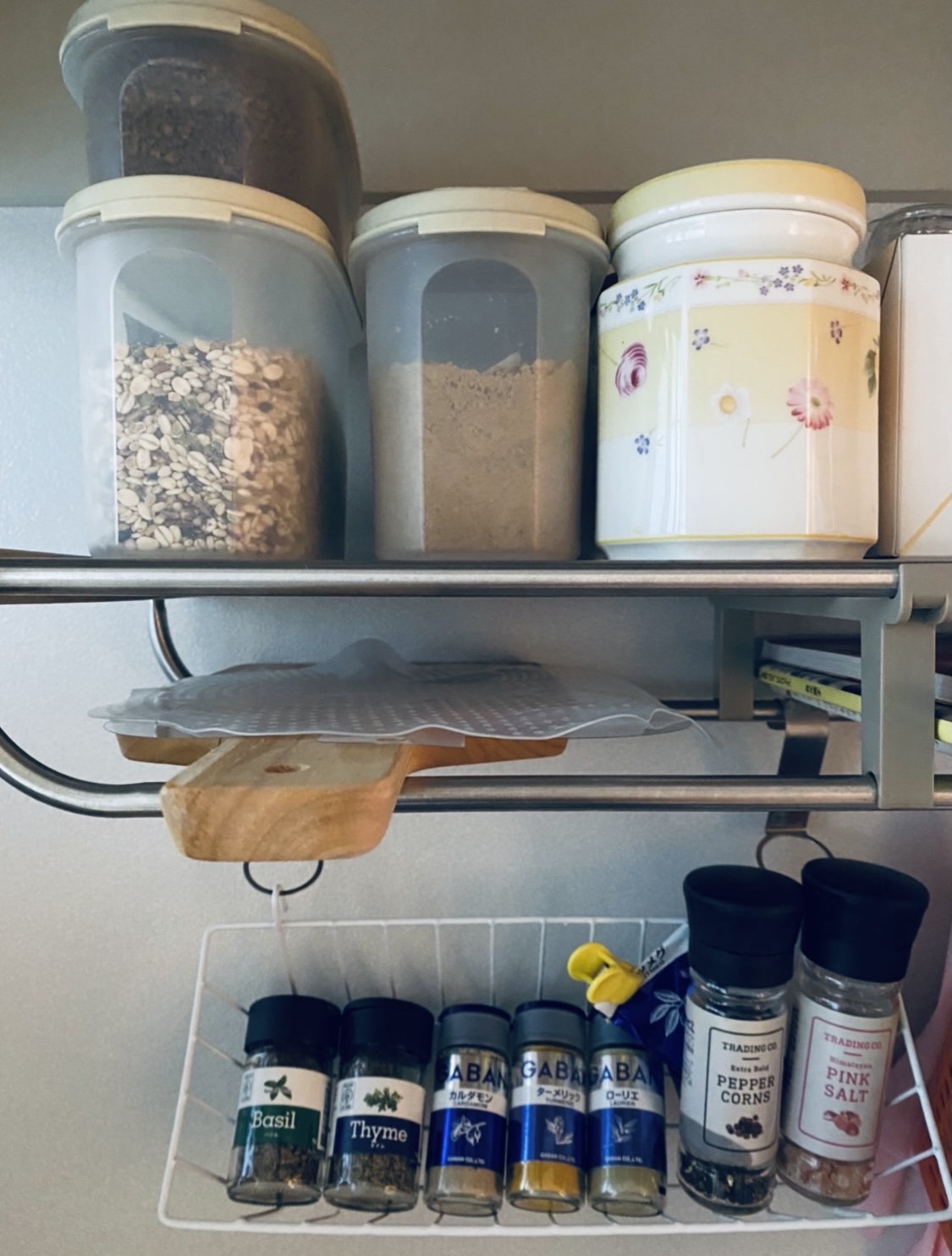 一番使う者たちの一部のスパイスと香りたちなんですが、一人暮らしのキッチンは狭いので吊るしたりくっつけたりと工夫しています