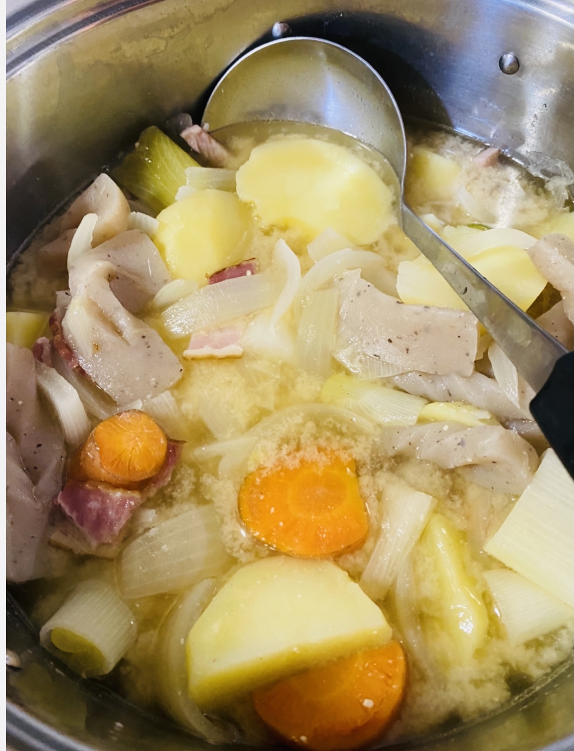 残念ながら買ってきて冷凍しておいた豚肉使い切ってしまっていっていたのでベーコンでいいかとか適当に入れて豚汁とは程遠くなってしまったのですがとってもおいしかったです